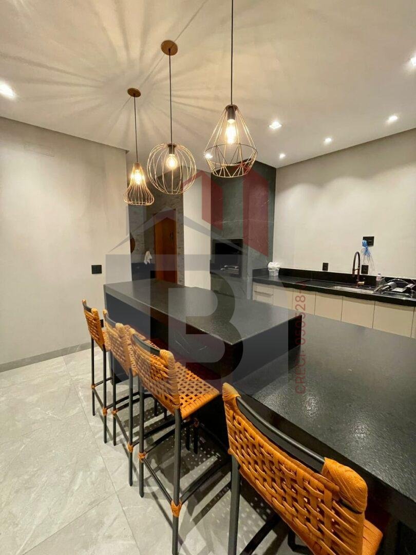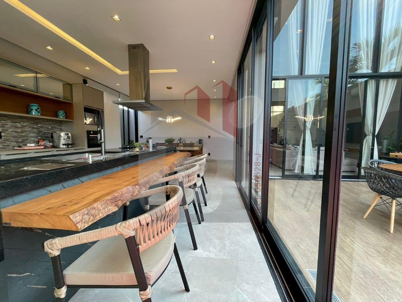 A área gourmet e a cozinha integrada à sala de jantar são totalmente mobiliadas e equipadas, incluindo mesa de jantar, buffet, geladeira, forno elétrico, adega, balcão em madeira maciça com cadeiras, além de um sofá com chaise que complementa o ambiente com elegância e aconchego.