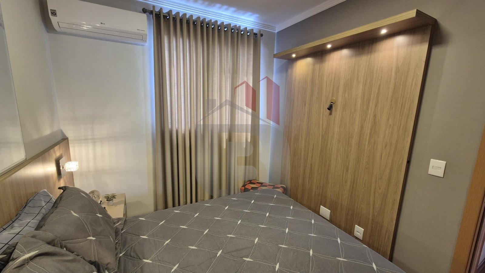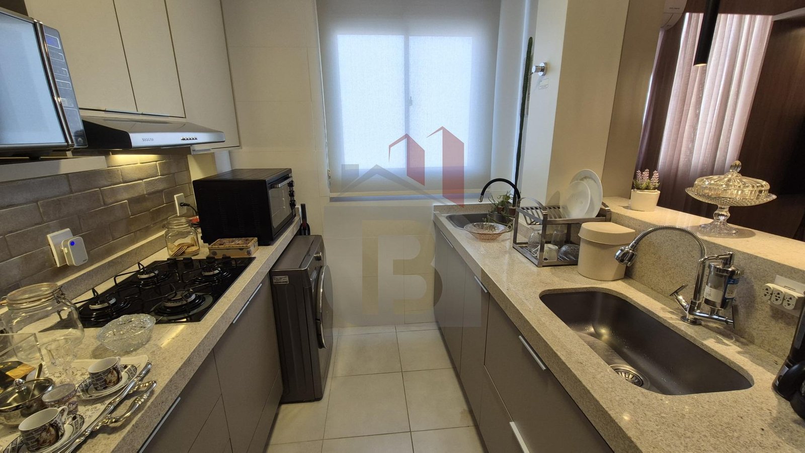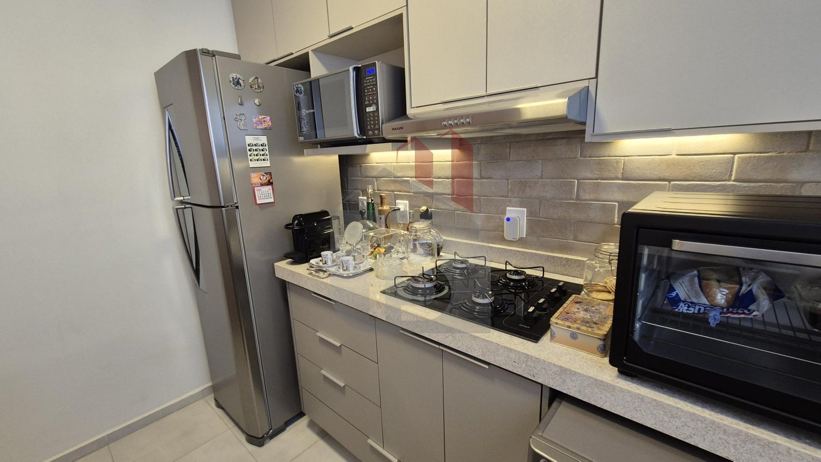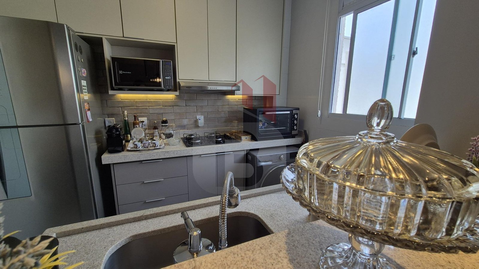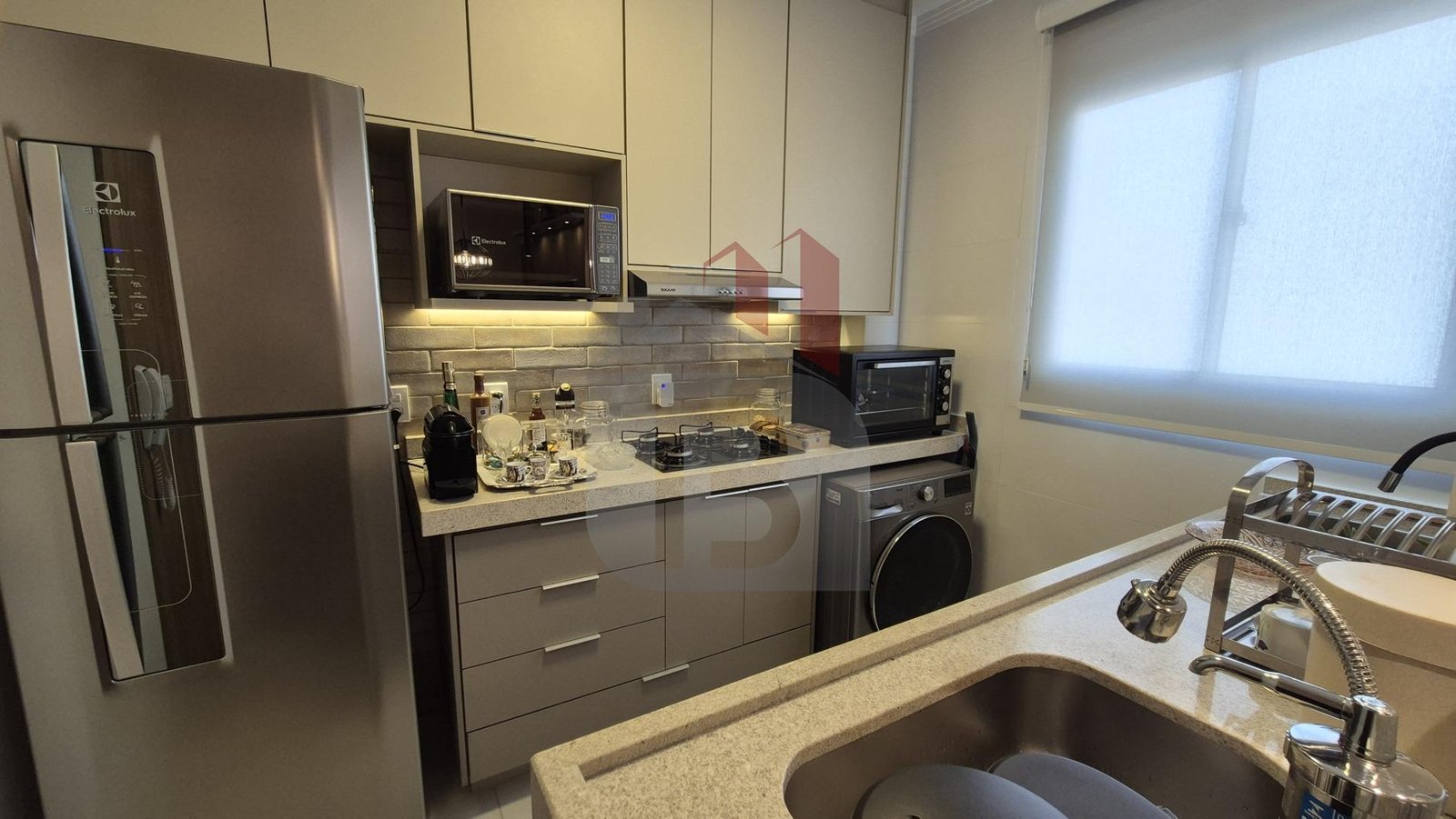 Com móveis planejados de alta qualidade, cozinha completa com depurador de ar e cooktop (nunca usado).