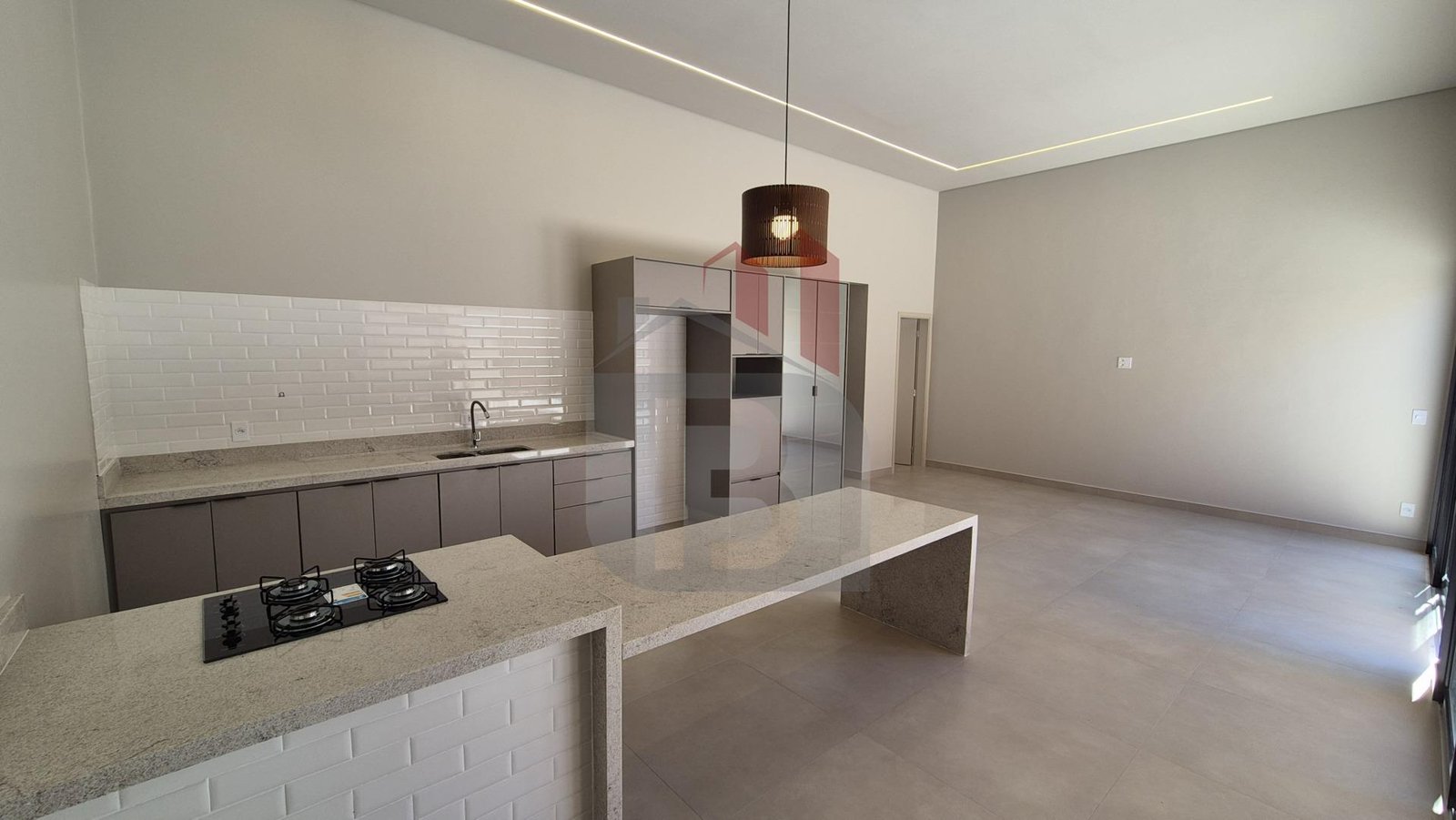 pé direito alto, iluminação moderna e integração perfeita entre sala, jantar e cozinha, criando um espaço amplo, elegante e extremamente convidativo.