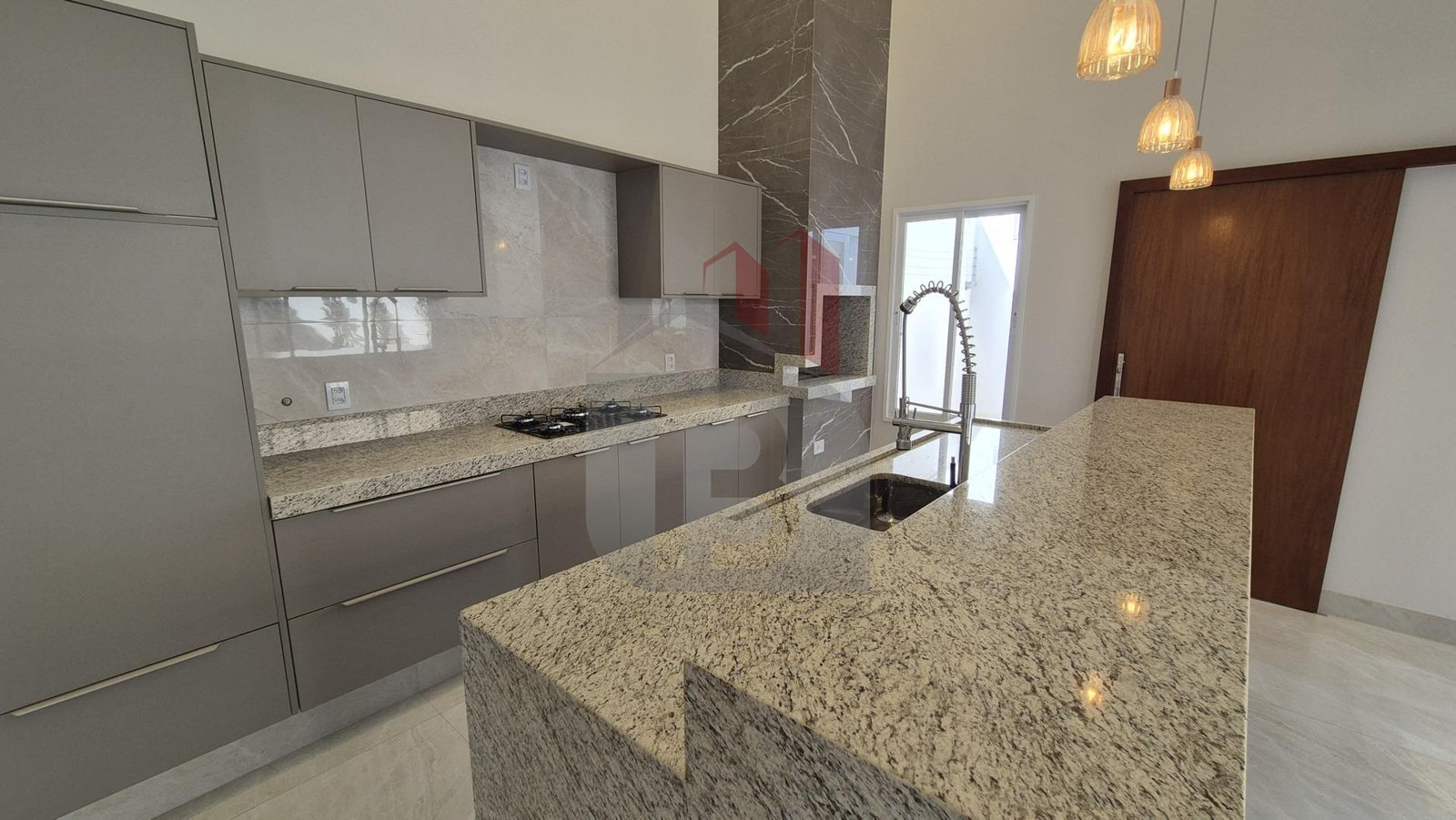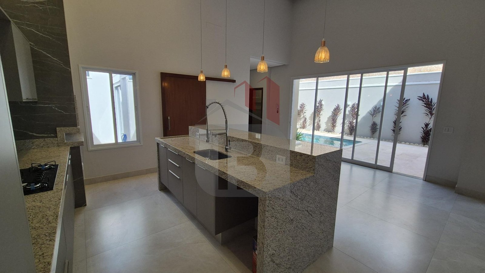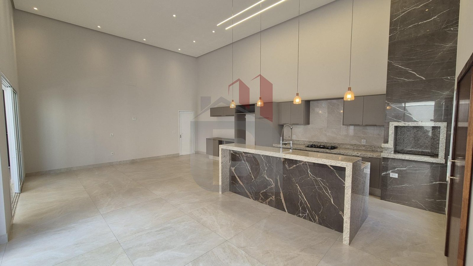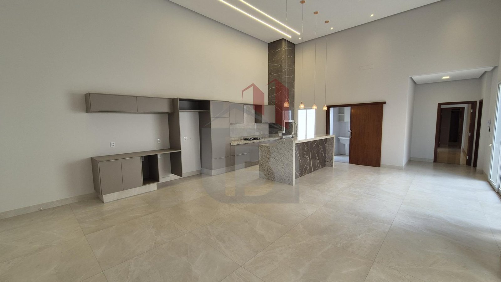 Com um projeto arquitetônico imponente, a casa conta com pé-direito alto de 5 metros na sala e cozinha, proporcionando amplitude, iluminação natural e uma sensação única de liberdade nos ambientes integrados.